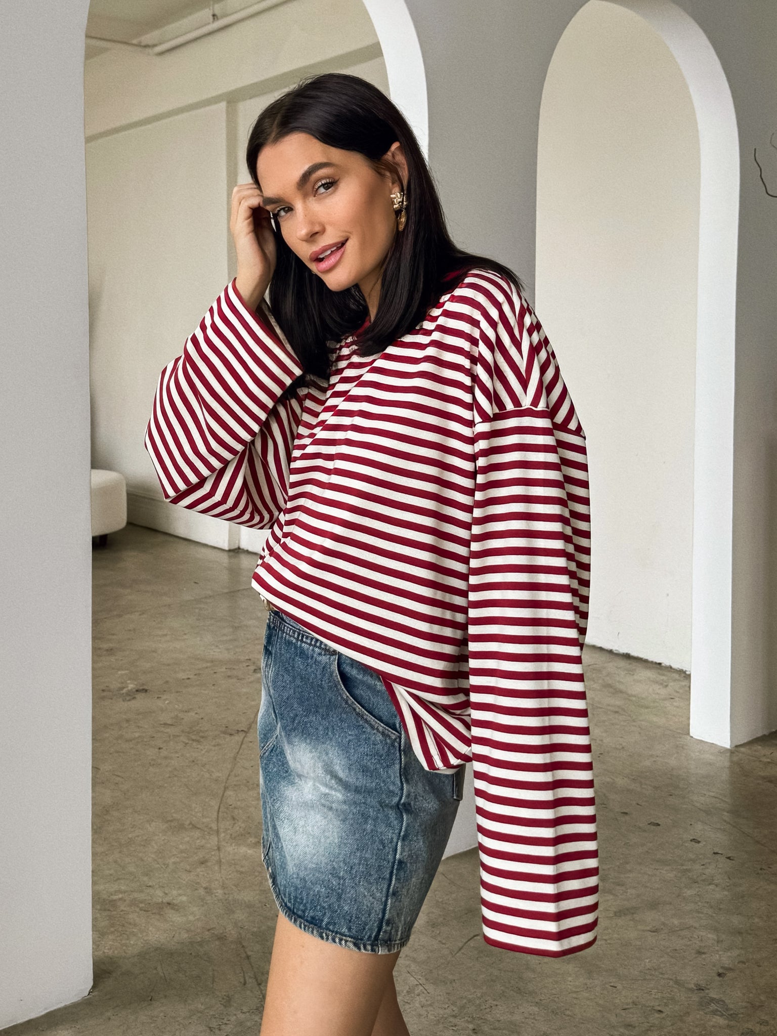 We’re bringing stripes into the New Year with us. Introducing our NEW Finley Oversized Stripe Top! Style this top with your favorite cream denim and boots for a casual daytime look. Accessorize with a leather hobo bag and sunnies!